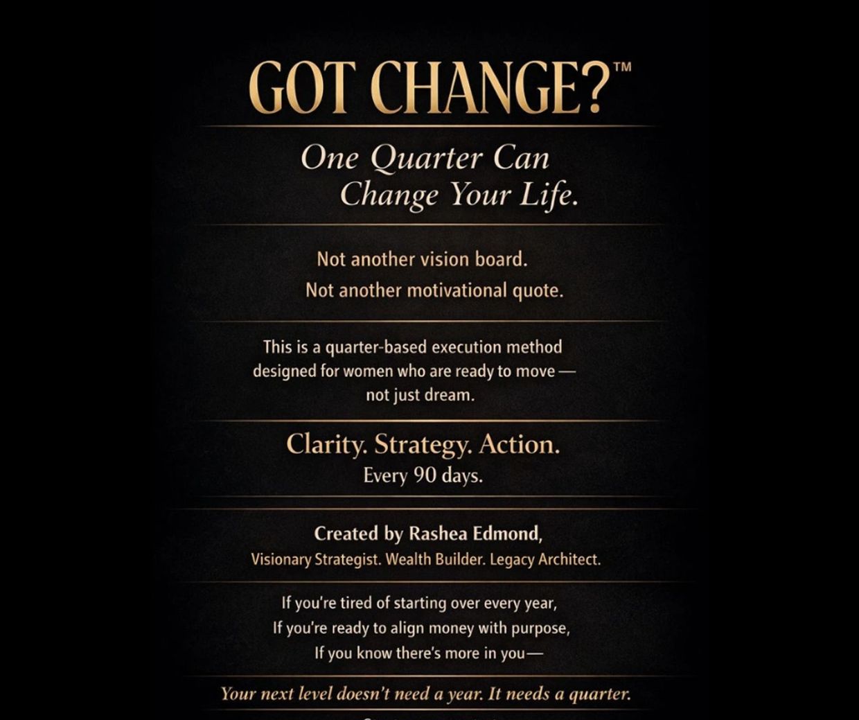 Created by Rashea Edmond, this quarter-based life and money method helps ambitious women stop surviving on autopilot and start building with intention. Instead of vision boards that look cute but never move, this system turns clarity into action — one quarter at a time.